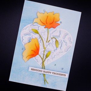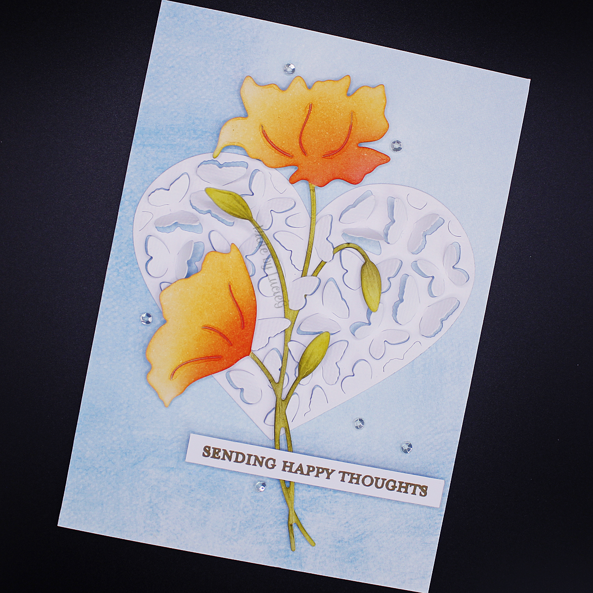 I started by using the Butterfly Heart Pop Out die (51-291) to cut some white card. I popped up the butterfly wings and adhered it to my card base. I then cut the Finesse die (51-679) and coloured it with my regular distress inks and a little coloured pencil before adhering it on top of the heart.