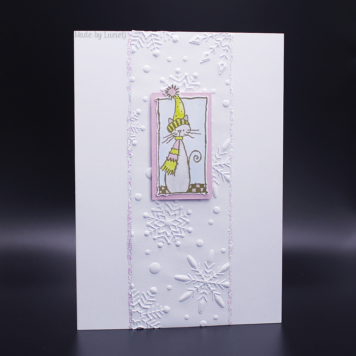 When I saw the theme was pets, I immediately thought of my Stampendous Kitty Claws wood-mounted stamp. I can’t believe it’s been FOUR YEARS since I last used him for this card. This time, I paired him with a Spellbinders embossing folder which I used for the centre strip. I saw that the embossing made the strip edges appear wonky so I hid them with a generous application of stickles!