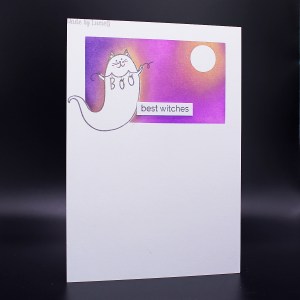 I stamped and embossed the cute kitty ghost from the Ghostly Greetings (30-594) set and added a touch of shimmer using my Twinkling H2O paints – so difficult to capture in a photo! I then used masking paper to mask him and a small circle before creating a Halloween sky with my distress oxide. I really wanted to create a luminescence around the moon and kitty image so I used a VERY light hand. This took a while to get right – I felt my first attempt (below) was a bit heavy!