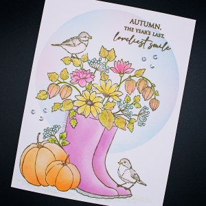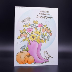 We had a few days of unseasonably warm weather recently so I’ve spent a lot of time in my garden – weeding and getting it ready for winter. Today I decided I had earned a crafty day and felt that it was the right time to colour the image from the gorgeous Autumn Boots stamp set (31-013) that Penny Black kindly sent me last month. I will confess, I was a bit nervous to colour this image – especially the boots! I just want to do the image justice!