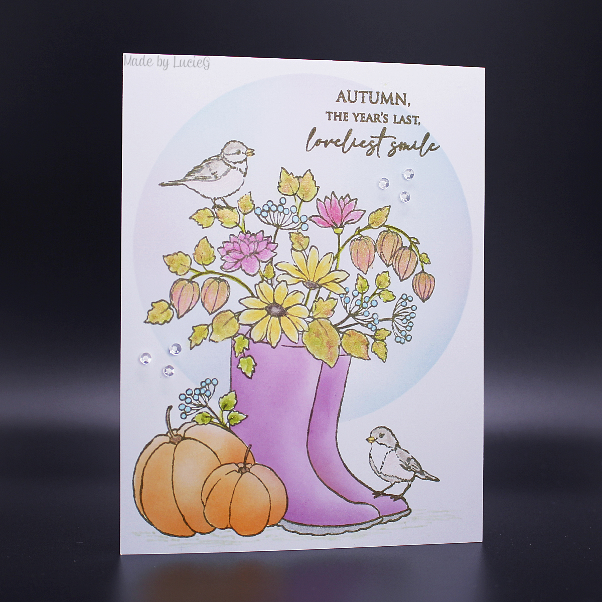 We had a few days of unseasonably warm weather recently so I’ve spent a lot of time in my garden – weeding and getting it ready for winter. Today I decided I had earned a crafty day and felt that it was the right time to colour the image from the gorgeous Autumn Boots stamp set (31-013) that Penny Black kindly sent me last month. I will confess, I was a bit nervous to colour this image – especially the boots! I just want to do the image justice!