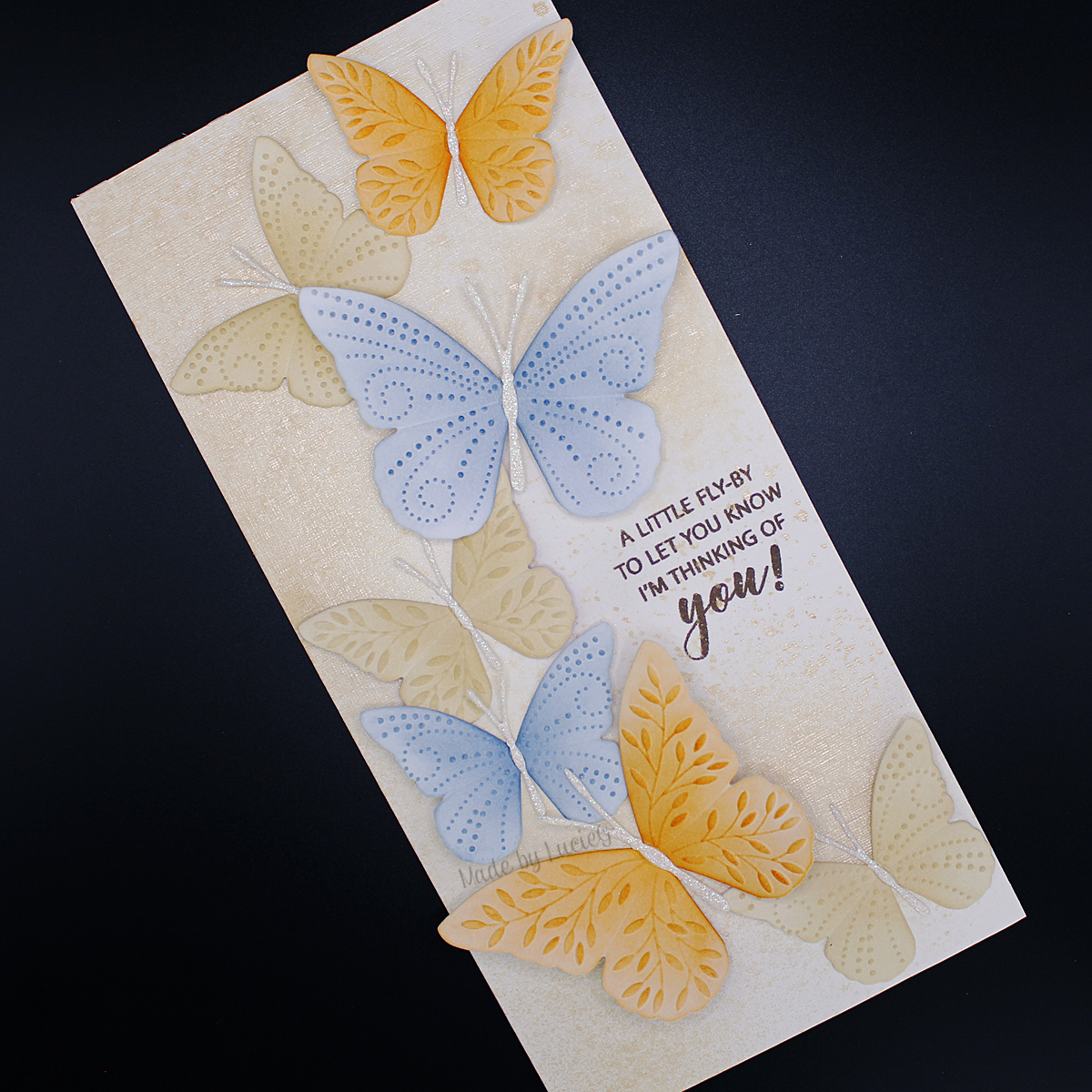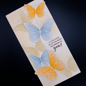 I stamped a sentiment from the Thinking of You set (30-825) that Penny Black kindly sent me before adhering the butterflies to my card base.