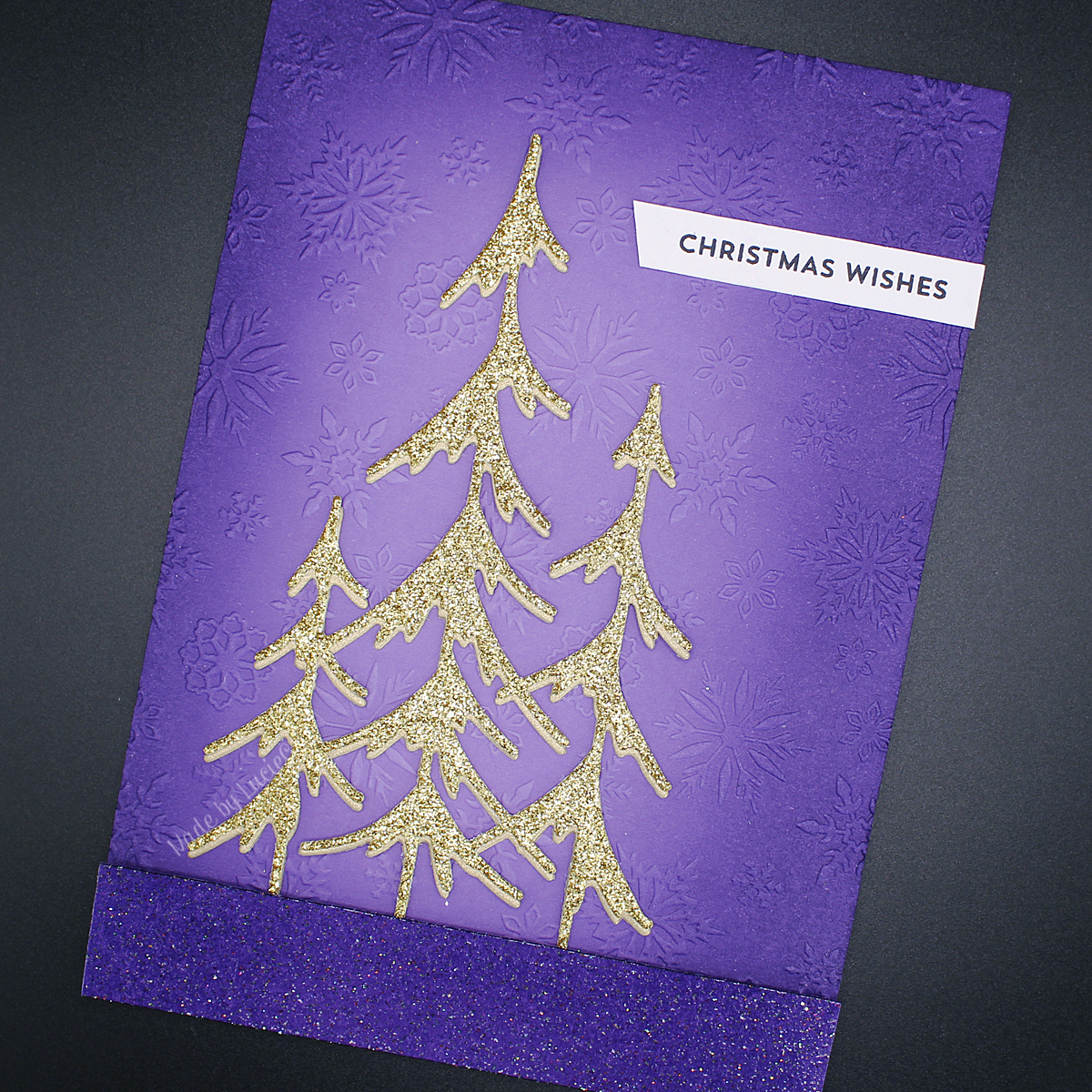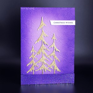 I cut gold glitter and pearlescent card with the fabulous Pointed Evergreens die by Simon Says Stamp and layered the glitter trees on top of the pearlescent image, slightly offsetting the image. I adhered the trees to my card base and then added a small purple panel that I’d covered with rainbow embossing powder as I didn’t have the right shade of purple glitter card. I had wanted to use Distress Sparkle Texture Paste which I really like but it took a LONG time to dry completely and so I had to find an alternative.