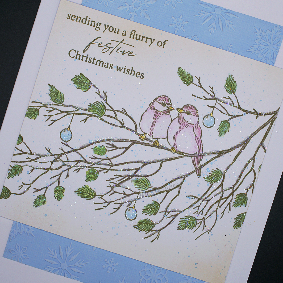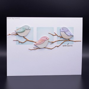 I created the background with a Taylored Expressions stencil that could have been made for the sketch and coloured the birds with distress inks and coloured pencil. I adhered the birds and a few branches from a Sizzix set to my card base and added a sentiment by Clearly Besotted.