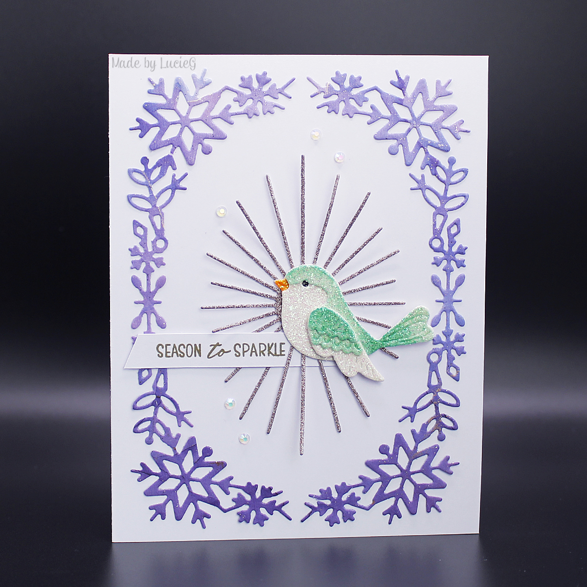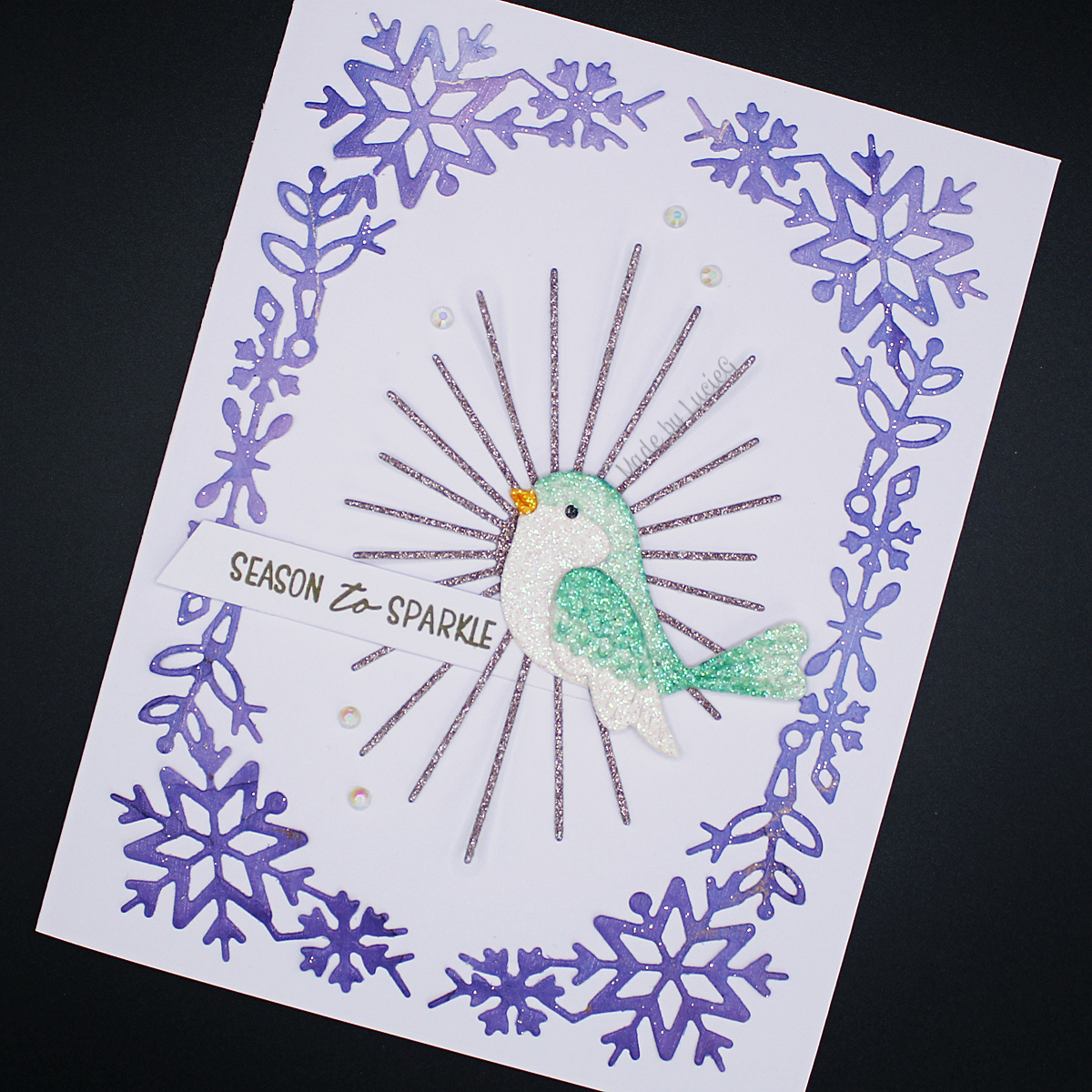 Once the paper was dry and sparkling, I cut the Snowflake Tall Curve border die twice and adhered it to my card base. To anchor my bird, I then added a glittery focal point cut using the fabulous Oval Burst die and added a Penny Black sentiment before adhering the bird and a few gems.