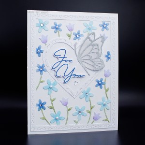 Today, I used the pretty, new to me Meadow blossom frame die and stencil set by Poppystamps – this was a joy to colour! I paired it with the Drifting Butterfly die and a sentiment by Memory Box.