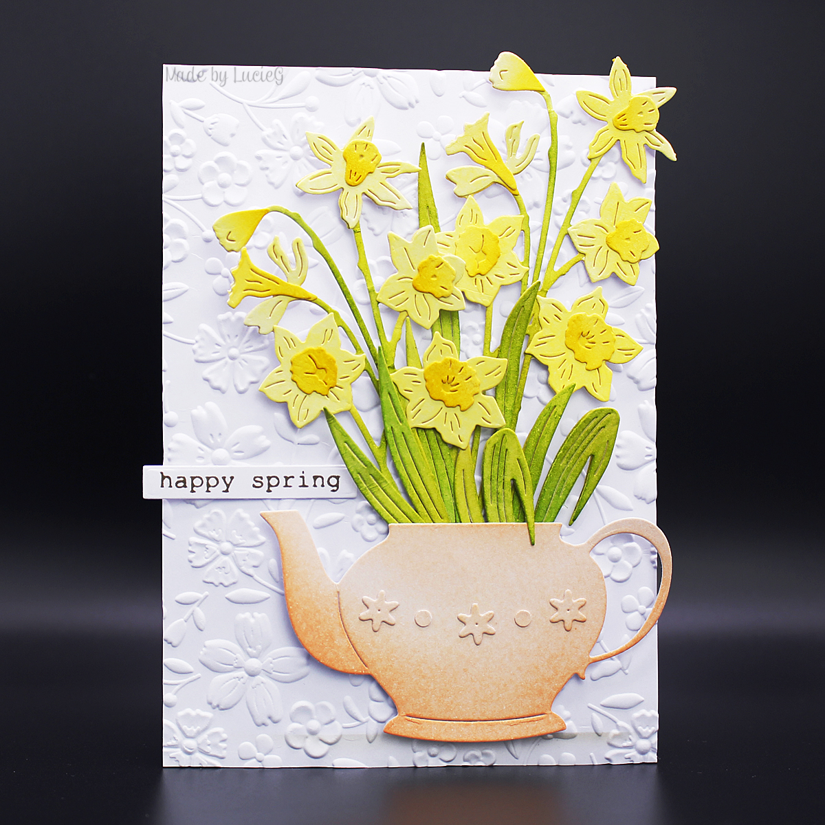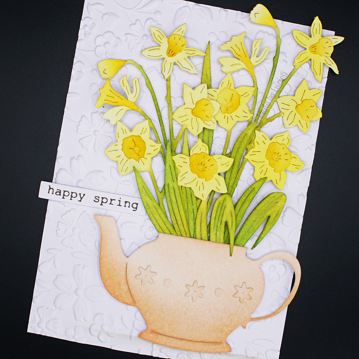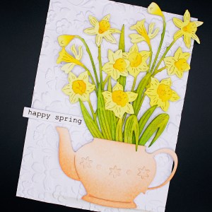 I arranged the die cuts on a base that I’d embossed with a Spellbinders’ folder and I added a few die cut flowers to teapot as well as a Memory Box sentiment to complete my card.