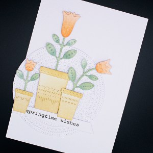 I decided to showcase a couple of new die sets that I just bought – the Nordic Flower Pot and Stems set and the Nordic Pattern Rings set by Poppystamps. I coloured the stems and pots with distress ink (Bundled Sage and Antique Linen) and added some tulip toppers cut from older Memory Box sets and coloured with Dried Marigold distress ink.
