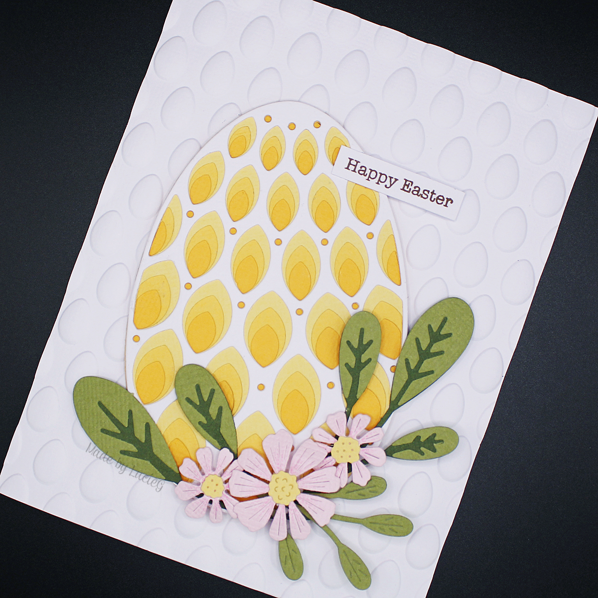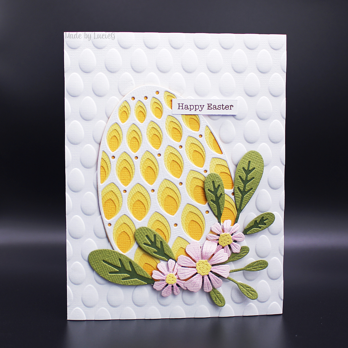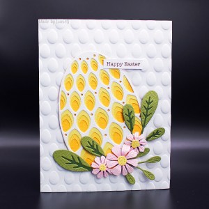 I adhered the adorned egg to a panel embossed using the Nellie’s Choice Egg embossing folder and added a sentiment by Simon Says Stamp to complete my card.