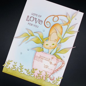 I chose a kitty from the fun Fancy Cat dies set (51-347) and the gorgeous Dignified die (51-821) and coloured them with distress inks. I blended some Tumbled Glass distress ink on my card base and adhered the elements – I ended up separating the leafy branches when arranging the elements in my teacup. I added a leafy border from the Garden Edgers die set (51-549) to ground the teacup plus a sentiment from the Love & Light mini stamp set (31-037) and some stickles and sequins!
