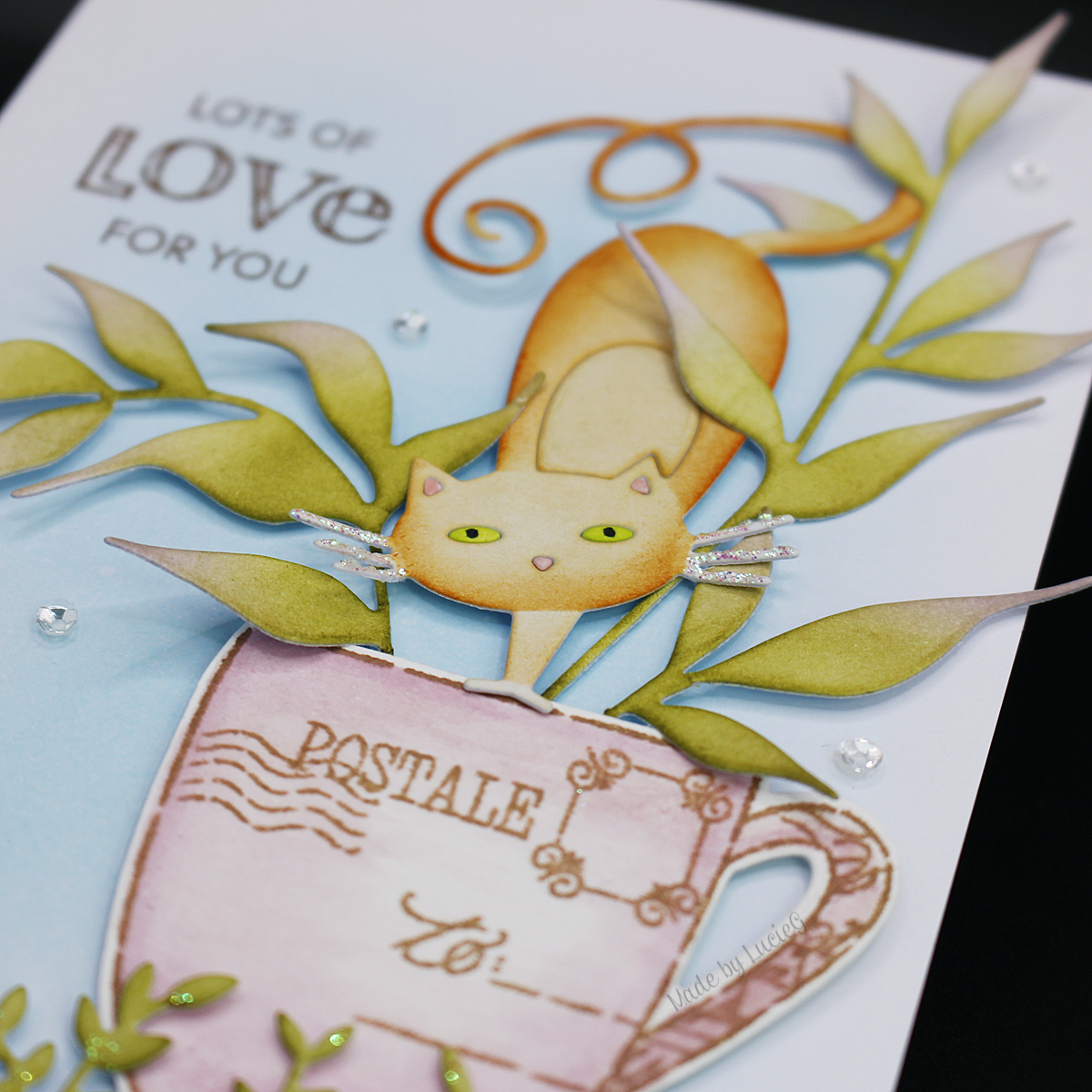 I chose a kitty from the fun Fancy Cat dies set (51-347) and the gorgeous Dignified die (51-821) and coloured them with distress inks. I blended some Tumbled Glass distress ink on my card base and adhered the elements – I ended up separating the leafy branches when arranging the elements in my teacup. I added a leafy border from the Garden Edgers die set (51-549) to ground the teacup plus a sentiment from the Love & Light mini stamp set (31-037) and some stickles and sequins!