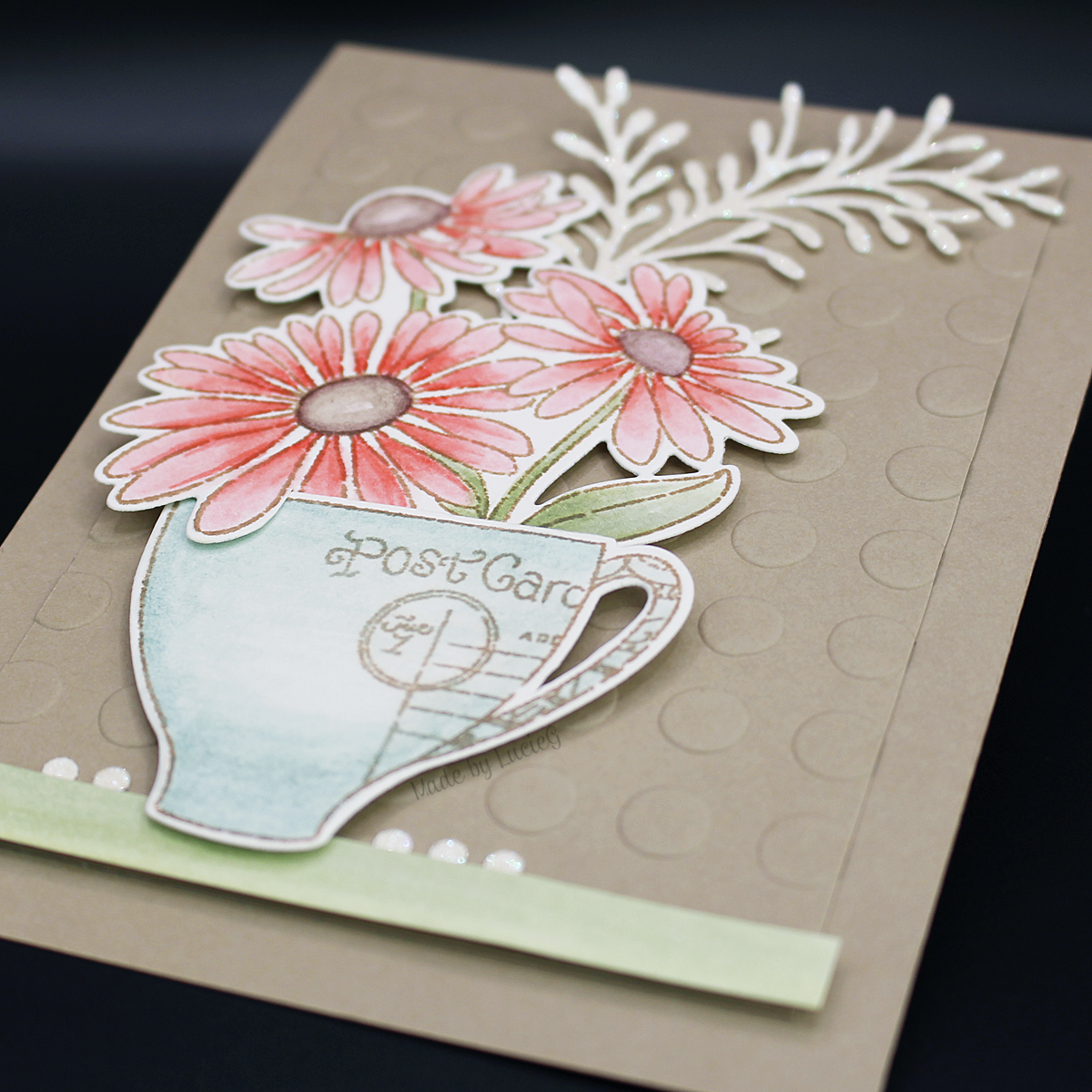 For the background, I embossed a panel of coloured card using the Rounded embossing folder (65-016), adhered it to a card base cut from the same colour card. Once I adhered the images, I felt it needed a little something extra so I added a branch, Airy (51-423), cut from glitter card and a small strip of green to ground the cup.