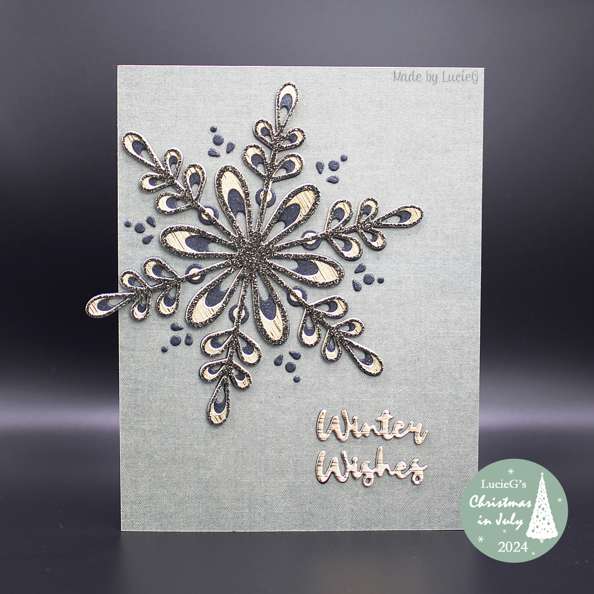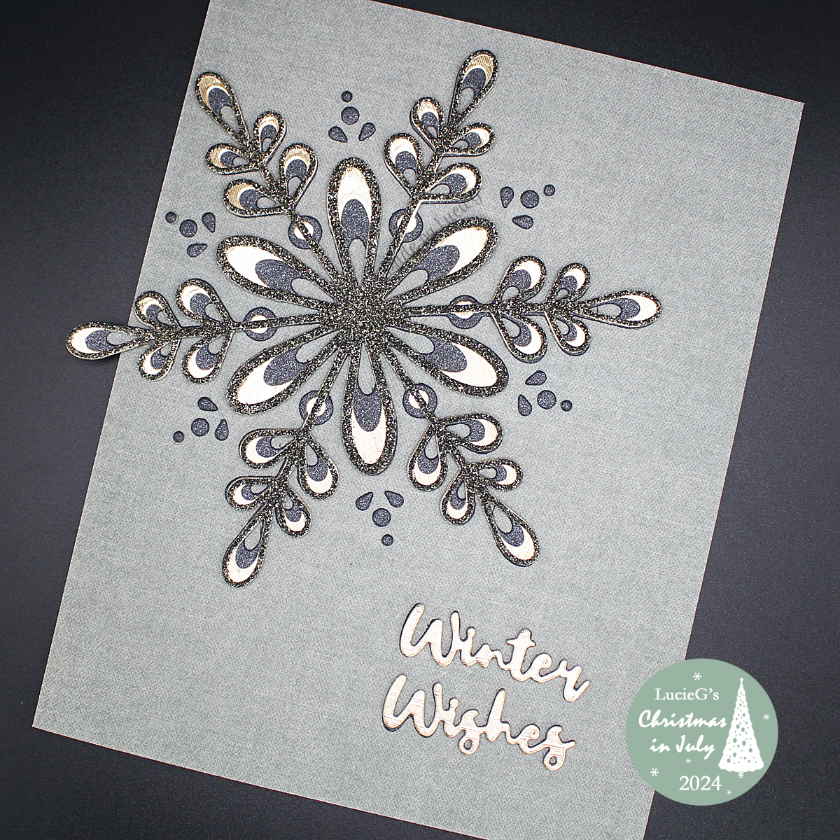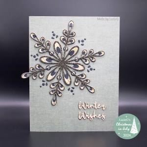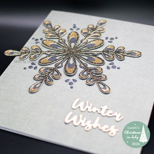 It’s another big layered set but works well with a standard US sized-card which is slightly wider and shorter than a UK A6 card. I covered my card base with some My Mind’s Eye paper and then die cut the three layers using black shimmer card, gold textured mirror card and quartz glitter card. The snowflake base die also cuts a pattern into the card stock so I stuck those small pieces onto my card base.