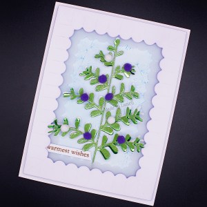 I really wanted to use the new Double Frames die set (51-825) last week when I was playing with the little chubby tree, so I knew that I would be using them for today’s card. I cut the inner die cut from vellum and the outer frame from white card which I covered with a VERY light layer of Villainous Potion distress ink. I lightly blended Broken China distress ink on the centre of my card base and stamped the branch from the Fragile set (31-087) a few times (third generation stamping to get that light tone-on-tone effect). I layered on the frames using foam tape.