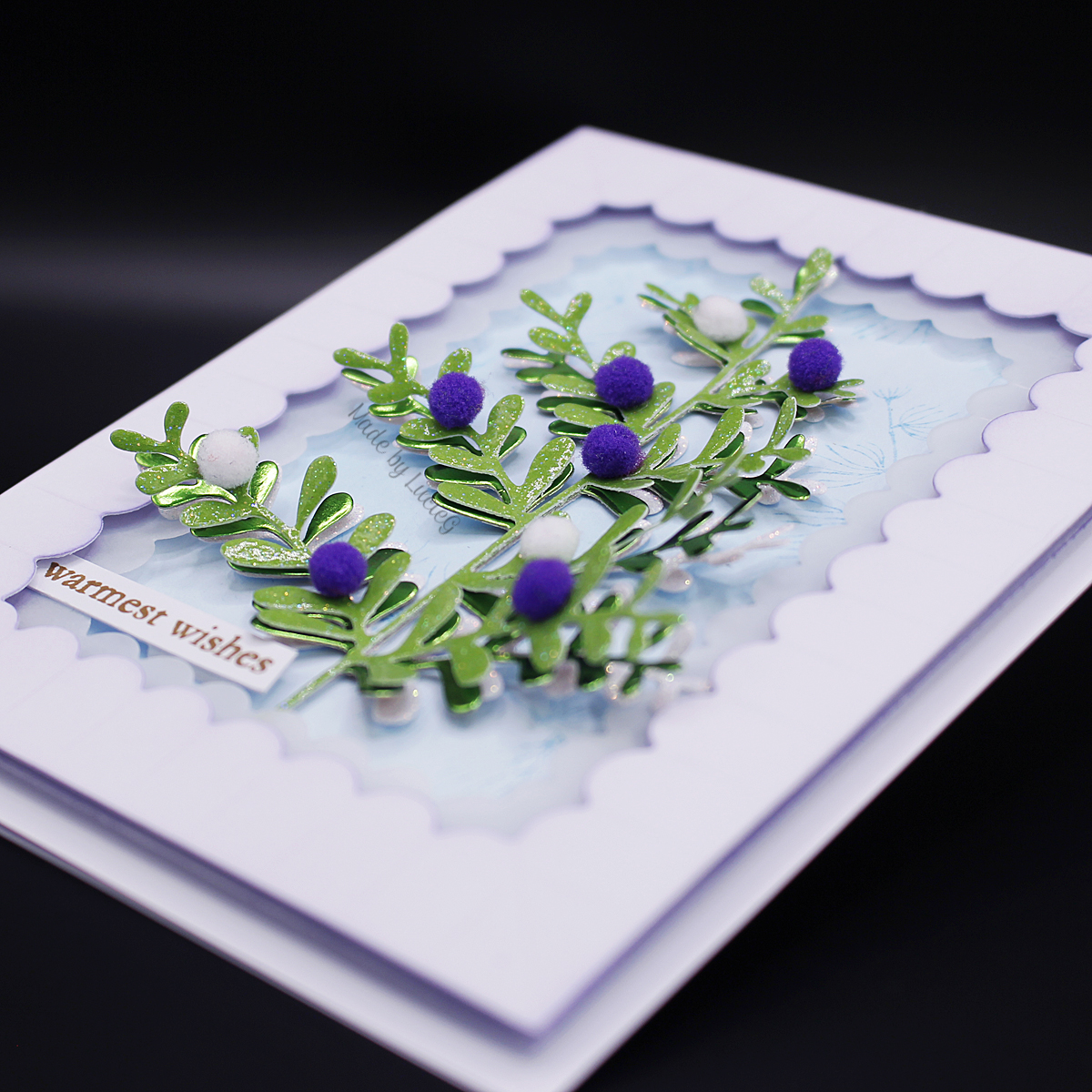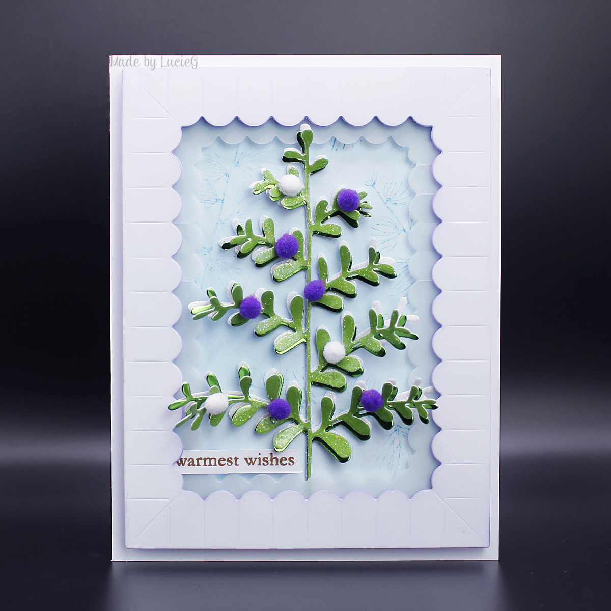 Next up, my focal point… today it’s the turn of the tree from the Berry Basket set (51-796) which I got last year but which was seriously neglected…. it’s such a fun, delicate design and worthy of as much attention as the little chubby tree really! Anyway, I cut it from green and white glitter card and also green mirror card and then layered the images together, adhering them along the stem only. After sticking it to my card base, I added a few mini pom-poms. Once they were firmly adhered, I fluffed up each of the stems and leaves… this card has a LOT of depth!