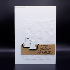 The background panel is a Simon Says Stamp embossing folder (I used the debossed side so that the cute ghosts didn’t overwhelm the kitties) and the sentiment is from a very old set by My Favorite Things.