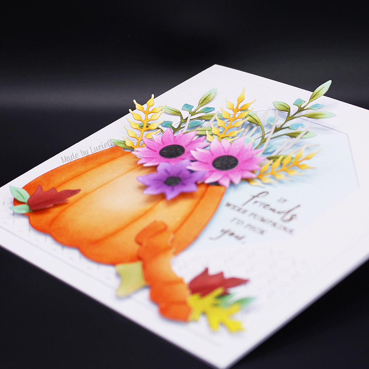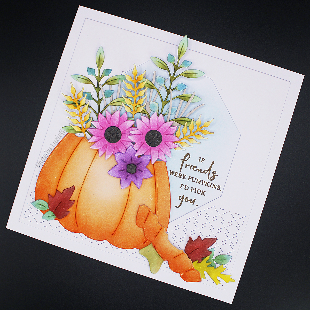 I coloured the pumpkin first before using an edger from the Border Collection die set (51-717) to cut off the top. I layered it on top of the All in one Hexagon background die (51-816) and then the fun really began and I added die cuts from the following sets: