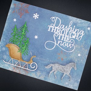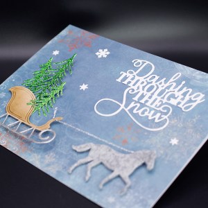 I cut the horse from felt and coloured the metal part of the sleigh with a silver deco pen. I adhered the images to a base that I’d covered with Bo Bunny paper and added a few trees, a Creative Expressions sentiment and a few snowflakes to complete my card.
