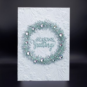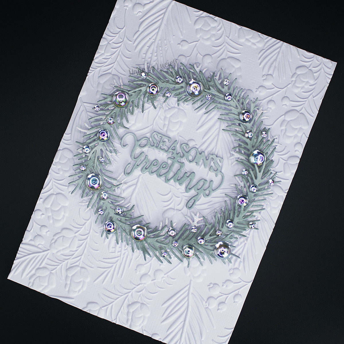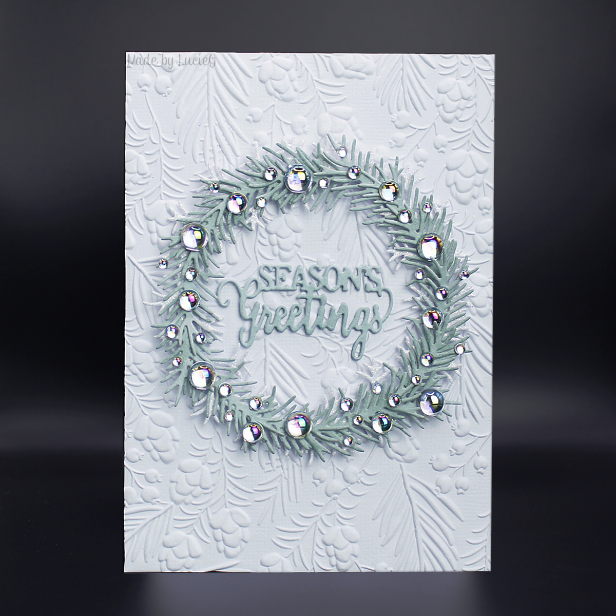 After some prevarication, I ended up creating a wreath with Spellbinders pine branch dies, bedecked with lots of fabulous dew drops for my take on the theme.