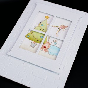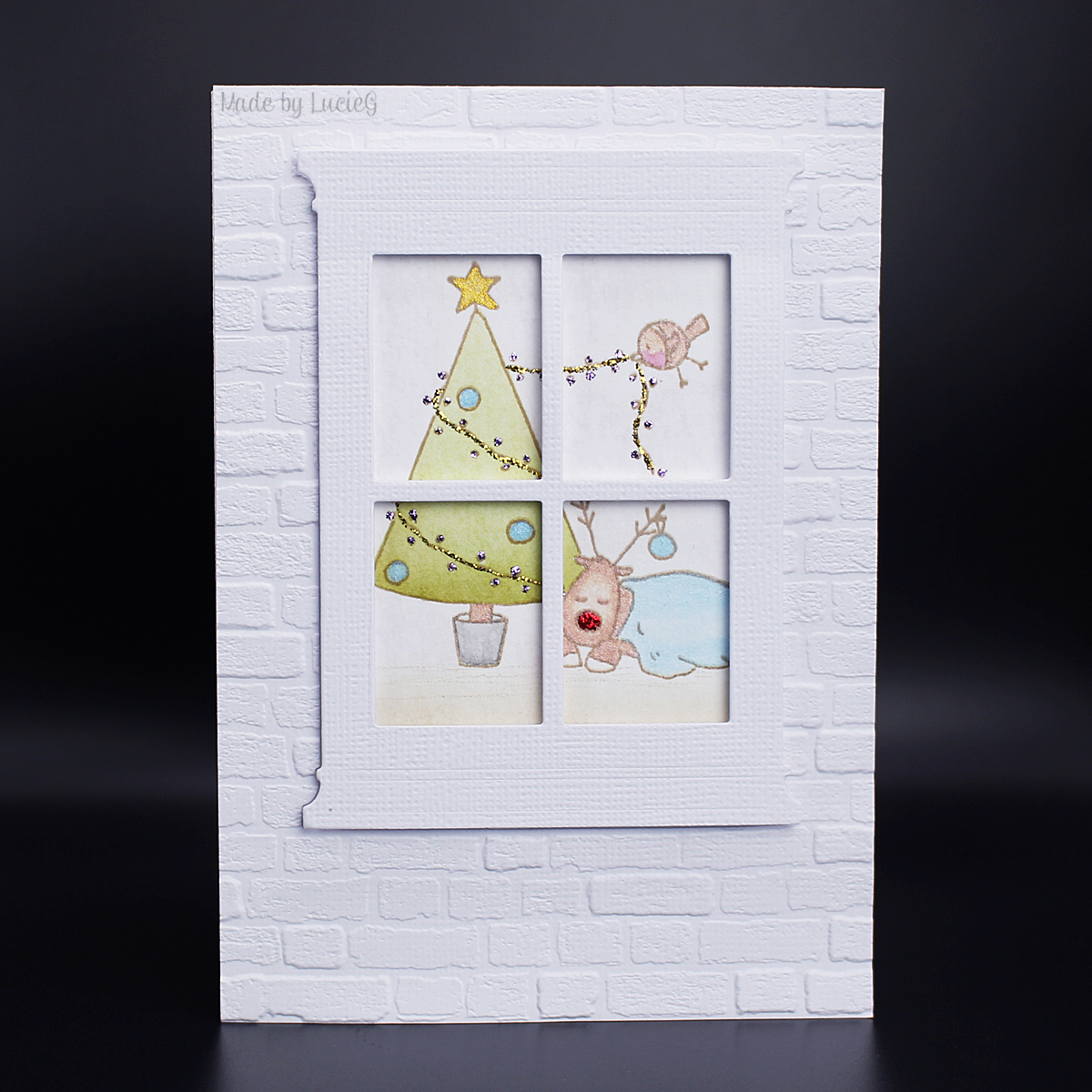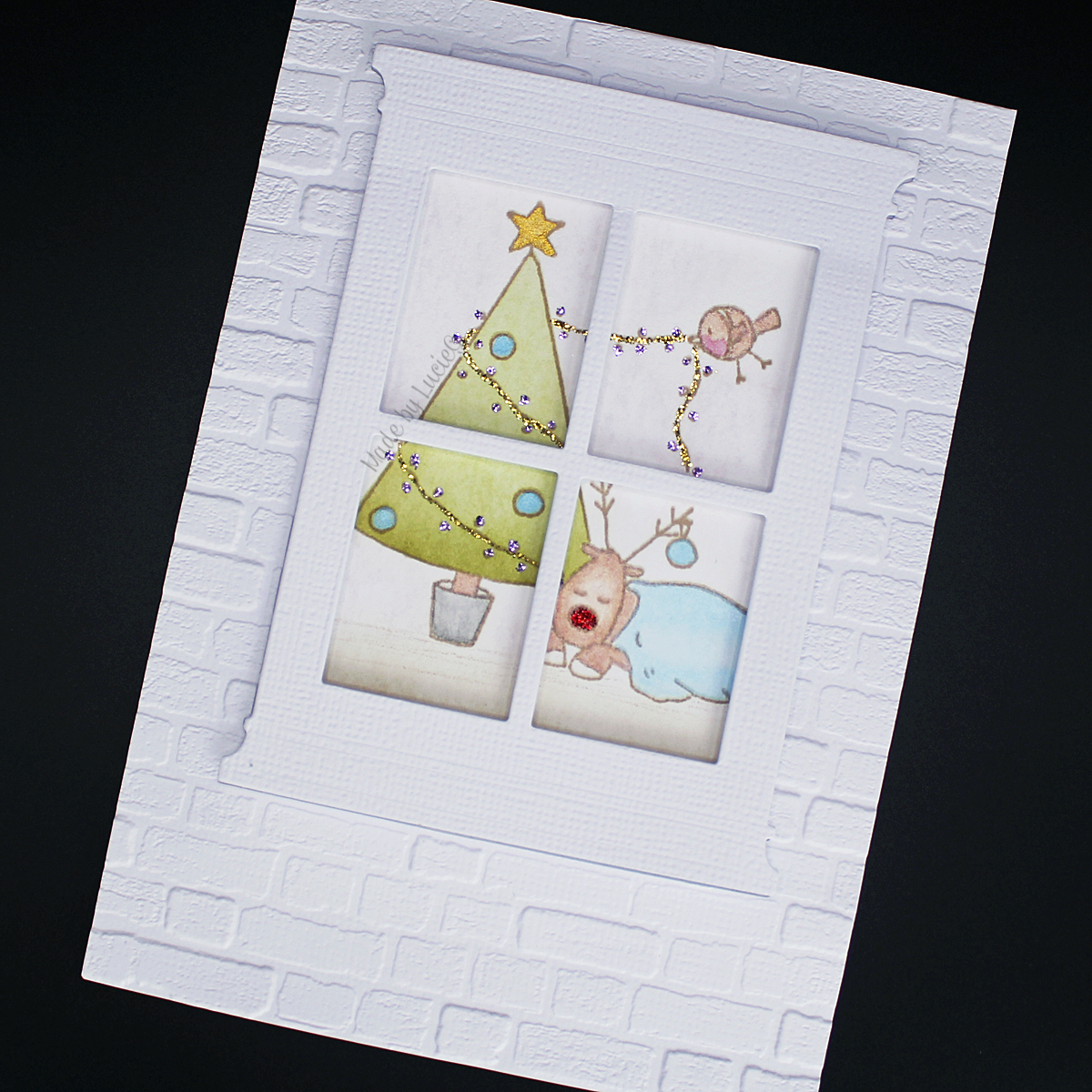 I coloured the image with my Twinkling H2O paints and distress inks and created a window scene using the Poppystamps Grand Madison Window die and a brickwork embossing folder by Stampin’ Up.