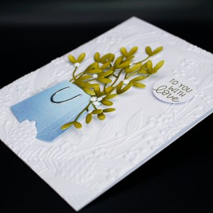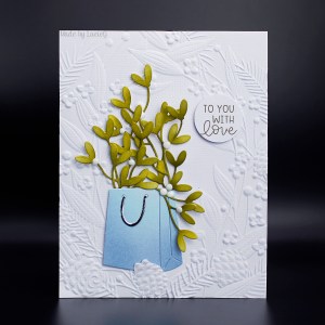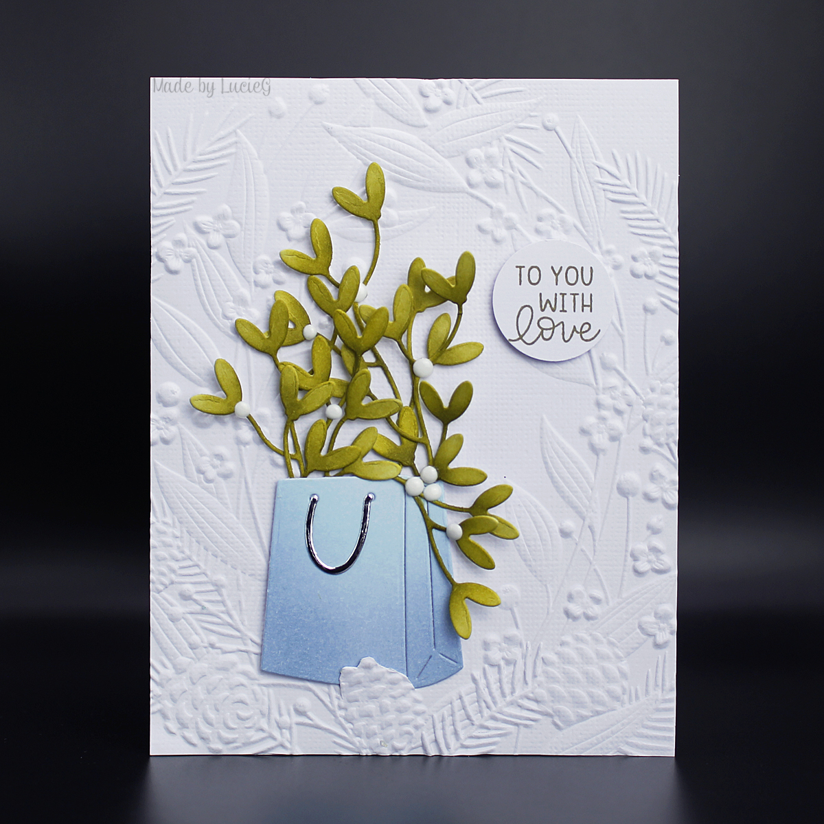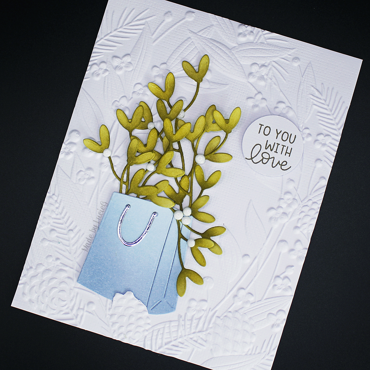When I saw the theme, I immediately thought I would use a Memory Box die that I use every festive season, but when I was going through my box looking for it, I spotted the lovely Mistletoe Branches dies by Waffle Flower Crafts and decided I should use that instead. I paired it with a Waffle Flower bag die and a Simon Says Stamp embossing folder.