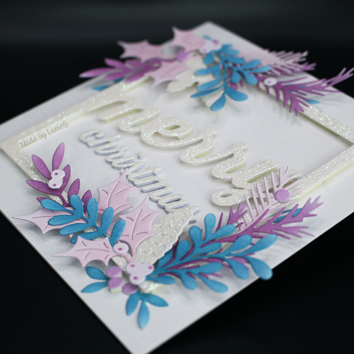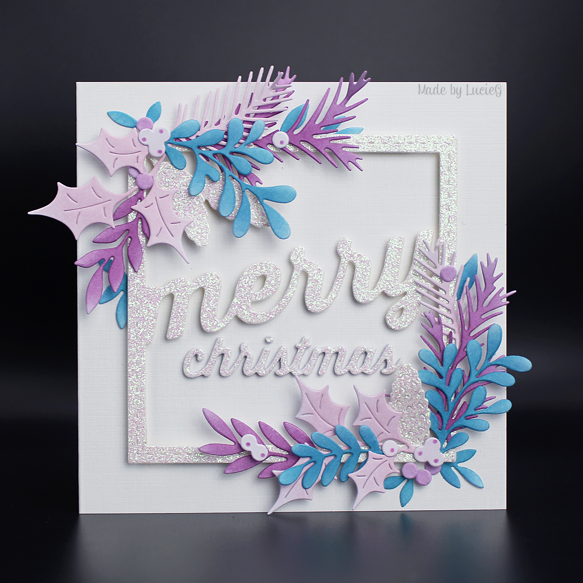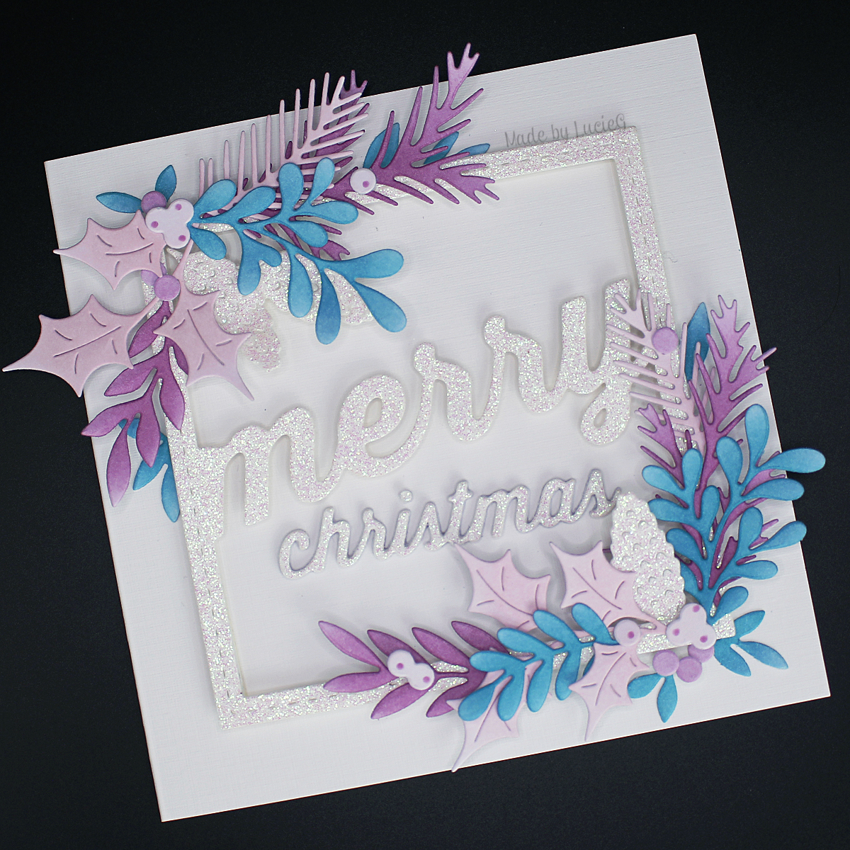 I used the Christmas foliage die set that was in the Pinkfresh Studios Holiday Cardmaking event kit and coloured the images with distress ink. I arranged them on am older Memory Box frame that I cut from white glitter card.