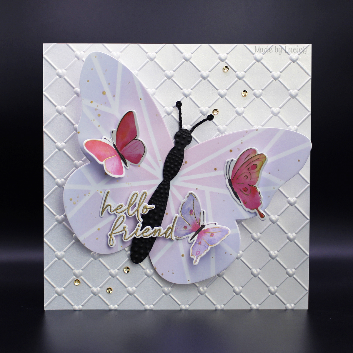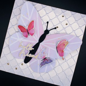 I chose a large butterfly die from a Spellbinders set and coloured it using the coordinating stencil. I cut and dry embossed a butterfly body from the set and I adhered the image to a pearlescent panel that I had embossed with a Spellbinders folder.  I added a few Pinkfresh Studio washi butterflies to the large butterfly, reflecting the sketch.