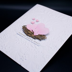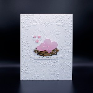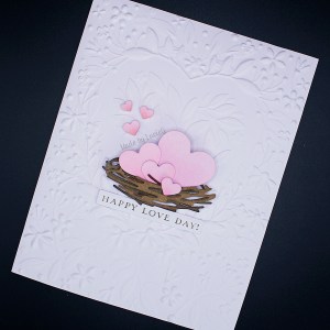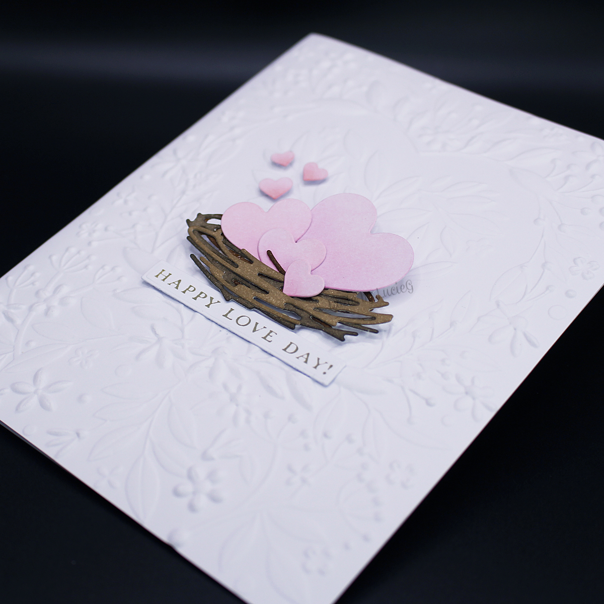 I paired it with some heart dies and an older Memory Box embossing folder and coloured the die cuts with distress inks. The sentiment is from an older wooden stamp.