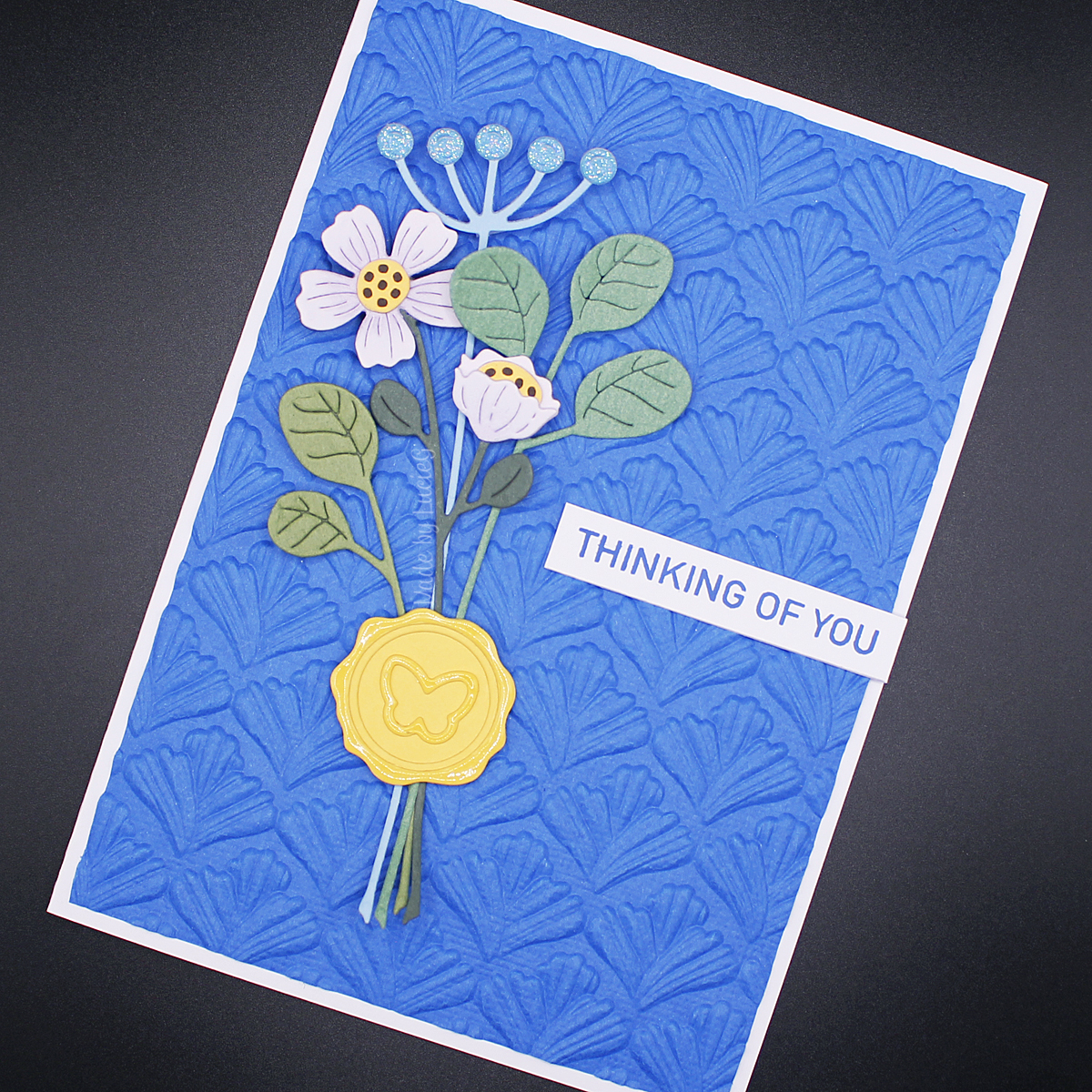 I’m pleased because I used my card scraps for the stems and I like how they turned out! I’ve been colouring stems with ink recently, but may make more use of my scraps this month! I never intended to have a blue background – I was literally just testing the layout against my embossing folder swatch when I realised the colours worked so I went with it… I need to do a new swatch now though!