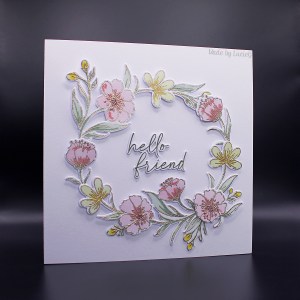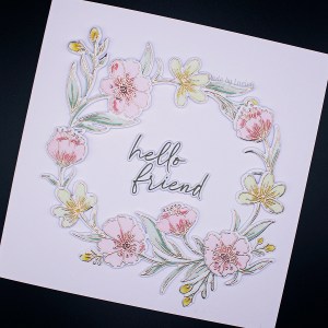 For today’s card I used the individual images to create a little wreath which actually serves as a frame for the sentiment that is from a set I received for one of their events last year. So I decided I could enter this into the current Pinkfresh Studio monthly challenge which has ‘Frame it Up’ as a theme.