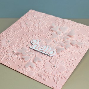 And so here we are today with the newest arrival in my craft room aka The Most Beautiful Embossing Folder Ever! This is the Altenew Piped Floral Lace 3D folder and I LOVE it! Just look at the incredible detail! It was VERY difficult to find a suitable die cut to add to this – in the end I cut some vellum with an older Honey Bee Studio die and added the Simon Says Stamp Giggle Hello die plus some pearls.