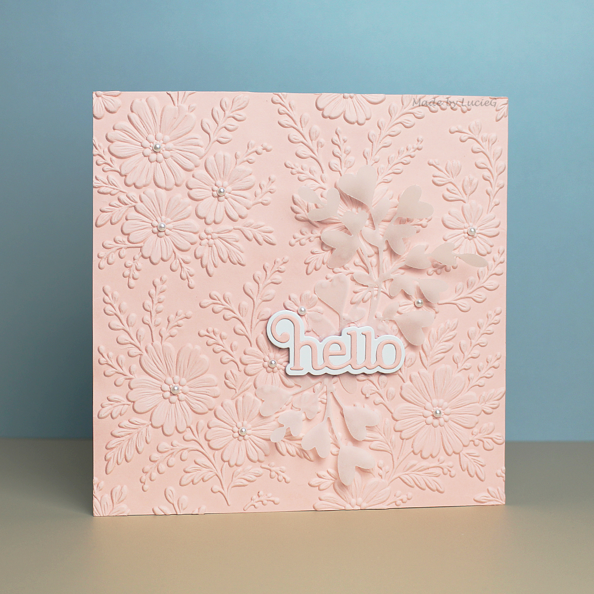 And so here we are today with the newest arrival in my craft room aka The Most Beautiful Embossing Folder Ever! This is the Altenew Piped Floral Lace 3D folder and I LOVE it! Just look at the incredible detail! It was VERY difficult to find a suitable die cut to add to this – in the end I cut some vellum with an older Honey Bee Studio die and added the Simon Says Stamp Giggle Hello die plus some pearls.