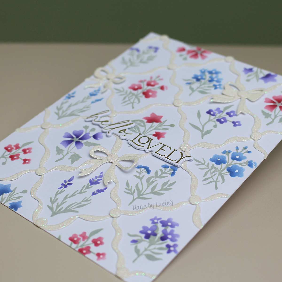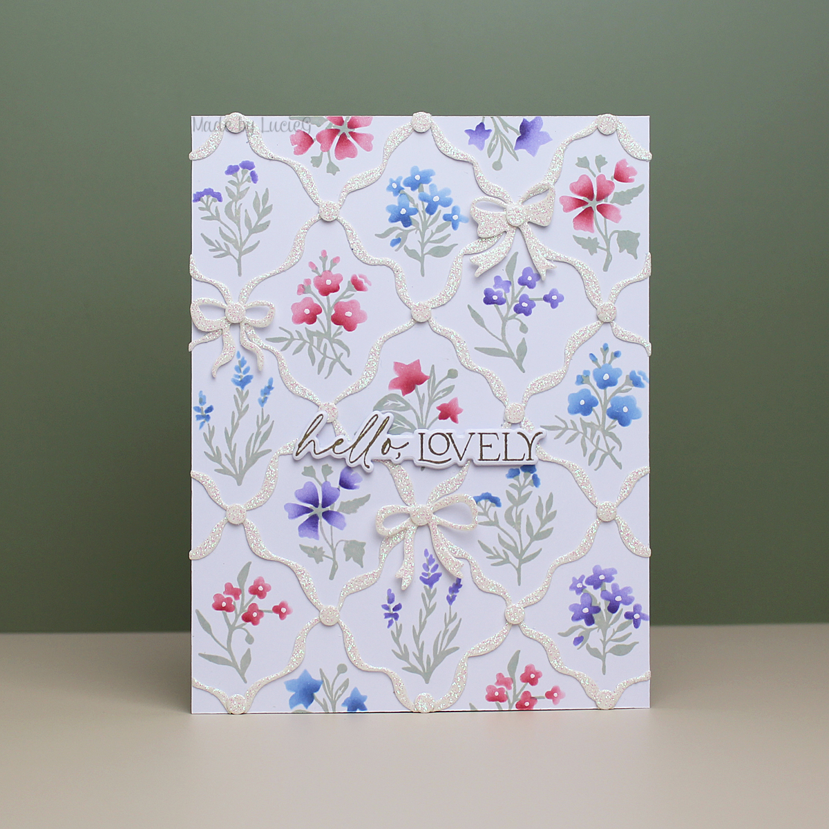 I added the Diamond Ribbons die cut to the image and adhered a few glittery ribbons and a Pinkfresh Studio sentiment to complete my card.