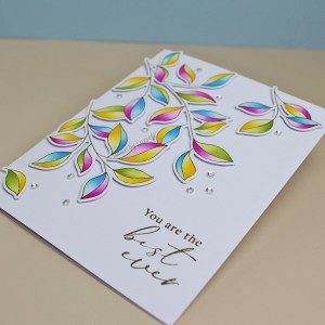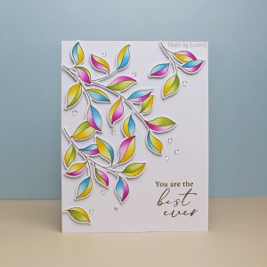 When I saw how the four stencils worked, I wasn’t too sure how best to use them… then I saw an amazing card on the Pinkfresh website The designer used a darker shade at the opposite end of each section of leaf – something that I would never have thought of doing but which gave an amazing impression of depth!