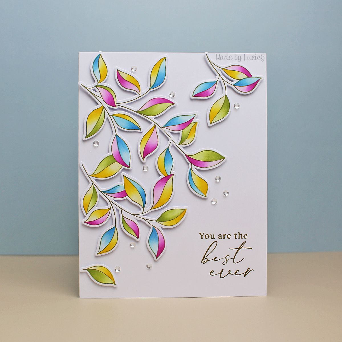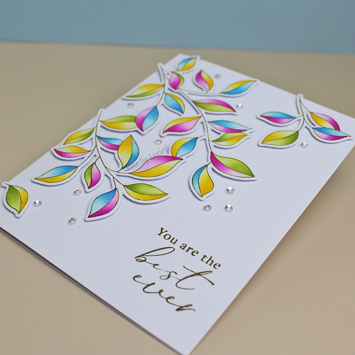 I chose another combo from my new inspiration book and got blending. It took a little while and I need a bit more practice, but I like how the leaves turned out! I added a few sequins and a sentiment from the Fluttering Butterflies set to complete my card.