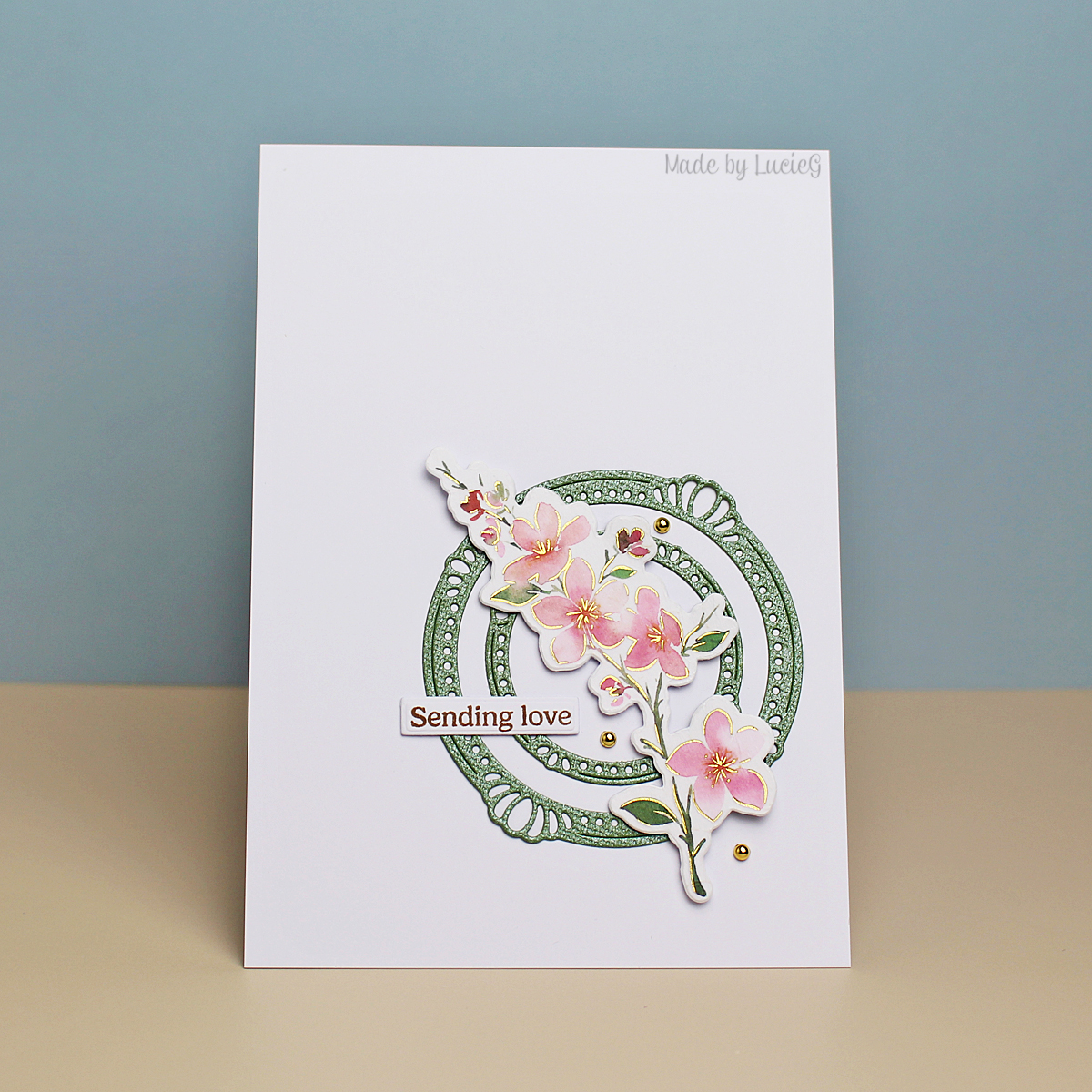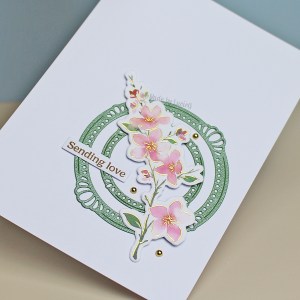 That beautiful branch is from the Sakura product suite. I’ve actually already used the stamp from this suite a few times, but this is the first time using the washi. My new product for today is actually a couple of dies from the Elegant Circles die set that arrived on Friday. I even used some of my Bazzill Bling cardstock – it matches the green of the leaves so perfectly!