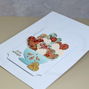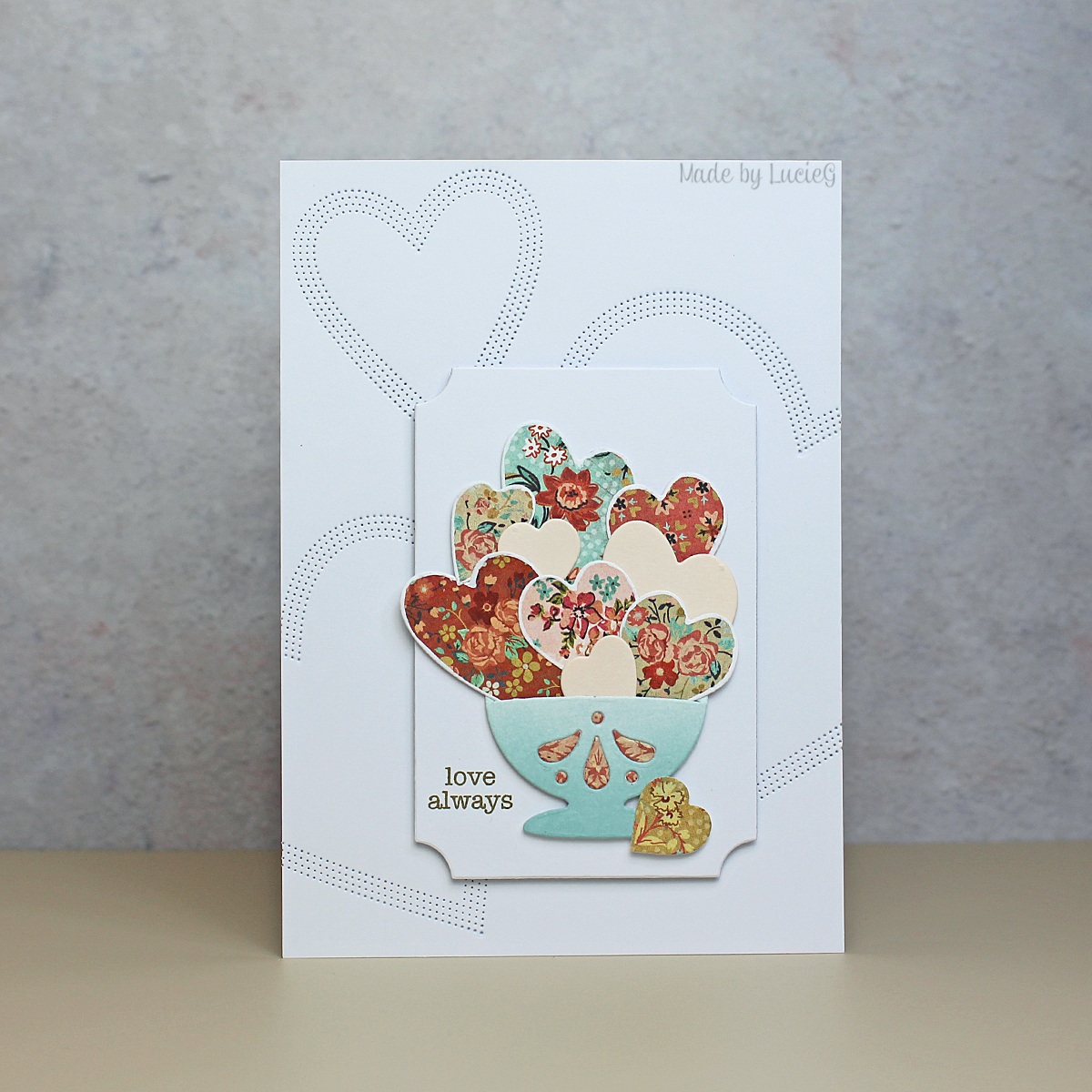 Today’s card has been a year in the making! I bought the cute Taylored Expressions egg cup dies last February with a view to making a cup full of hearts card but then something must’ve happened because I never got round to creating it! So today was the day. I dug into my beloved Basic Grey patterned paper mountain, pulled out some super old Simon Says Stamp/Kelly Purkey heart dies and got crafty!