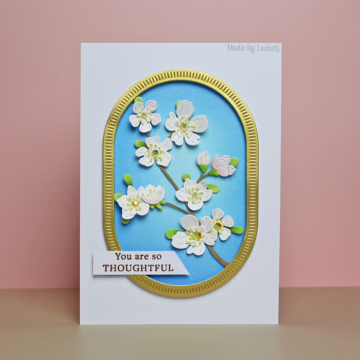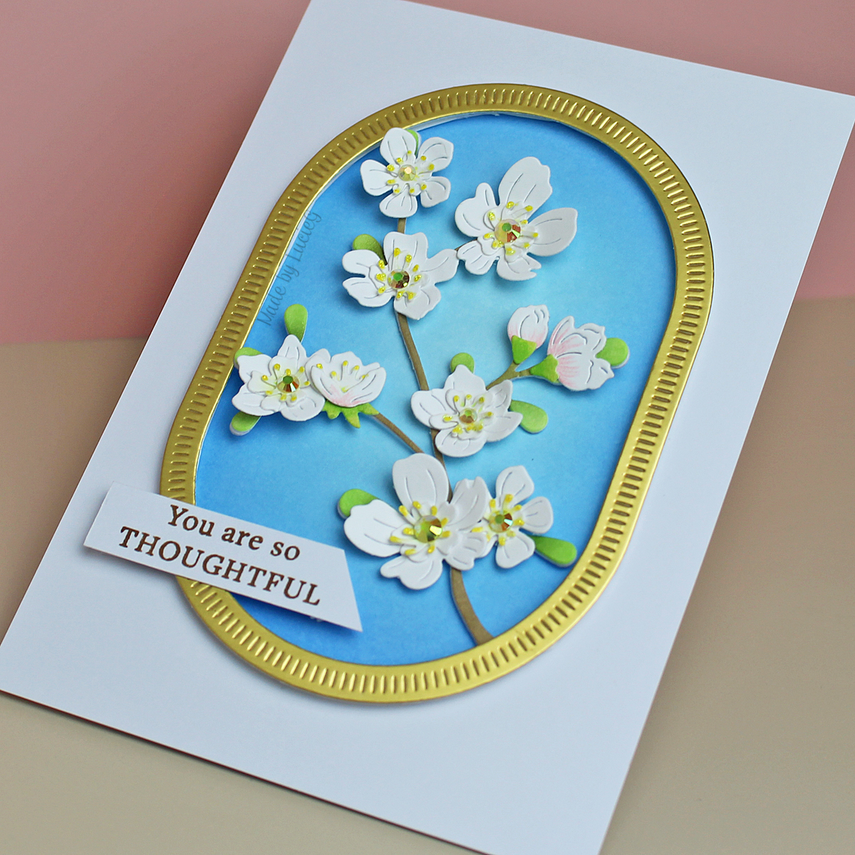 I picked up the Pinkfresh Studio Cherry Blossom die and stencil set last year and I’ve been waiting for now to use them! There’s very little colour on the blooms, just a touch of pink on the buds. This set also has a fabulous collection of leaves which I didn’t include as the Yoshinos don’t have leaves at peak bloom. Instead I coloured the parts of the branch that are intended for the leaves so that they would appear like buds.
