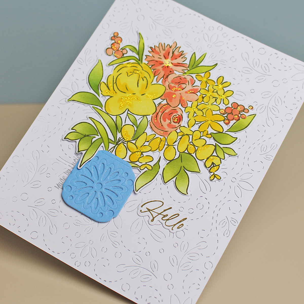 I had originally centred the vase and wasn’t going to add a sentiment. Then I decided to move the image to the left which opened up a great spot for a small sentiment – this one is by The Greetery.