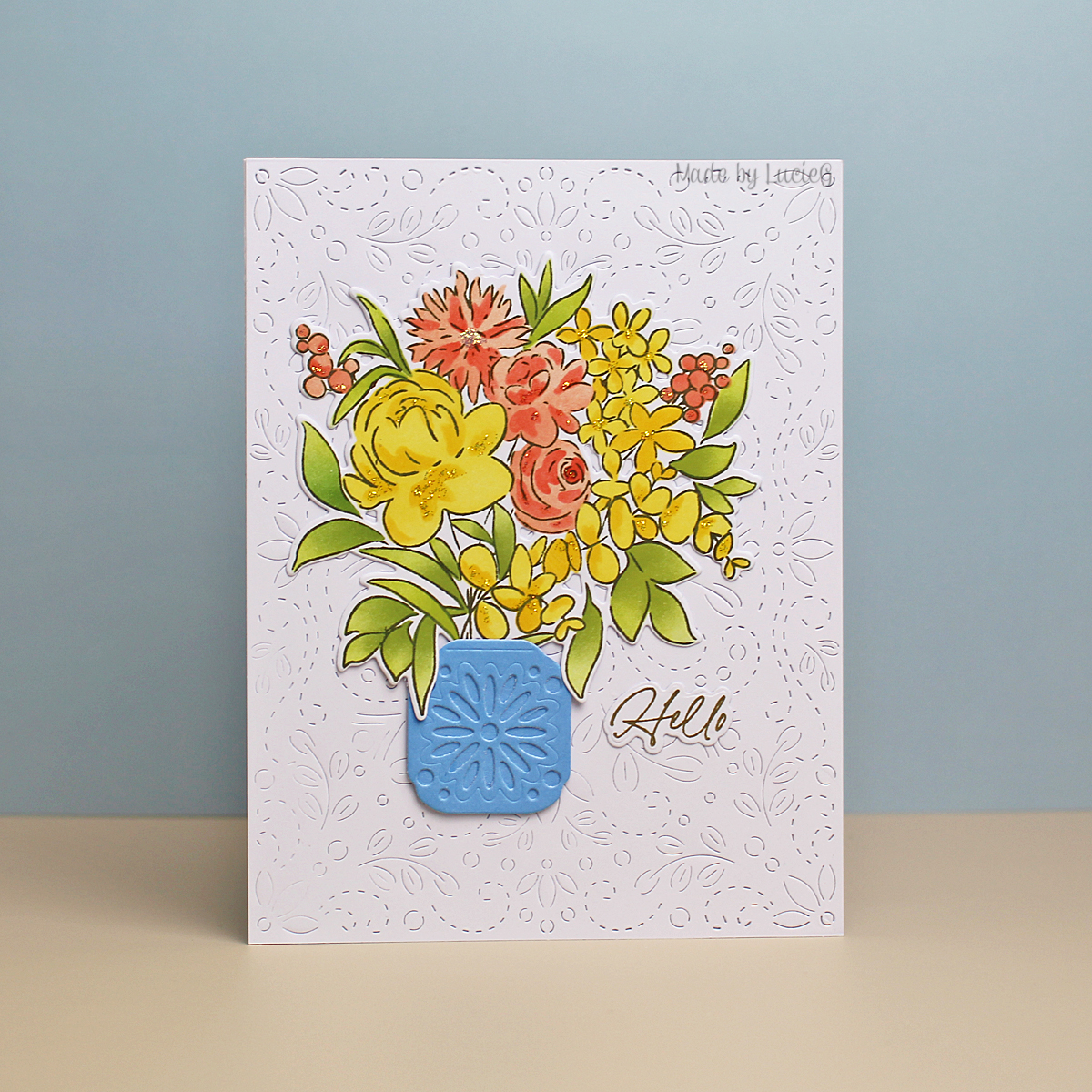 I wanted a bright and cheery card to a friend and totally stepped outside my comfort zone with the orange and yellow colour combo! I added an Altenew vase and adhered the images to a background panel that I had cut using the Charming Stitched Florals coverplate die, which I bought at the same time.