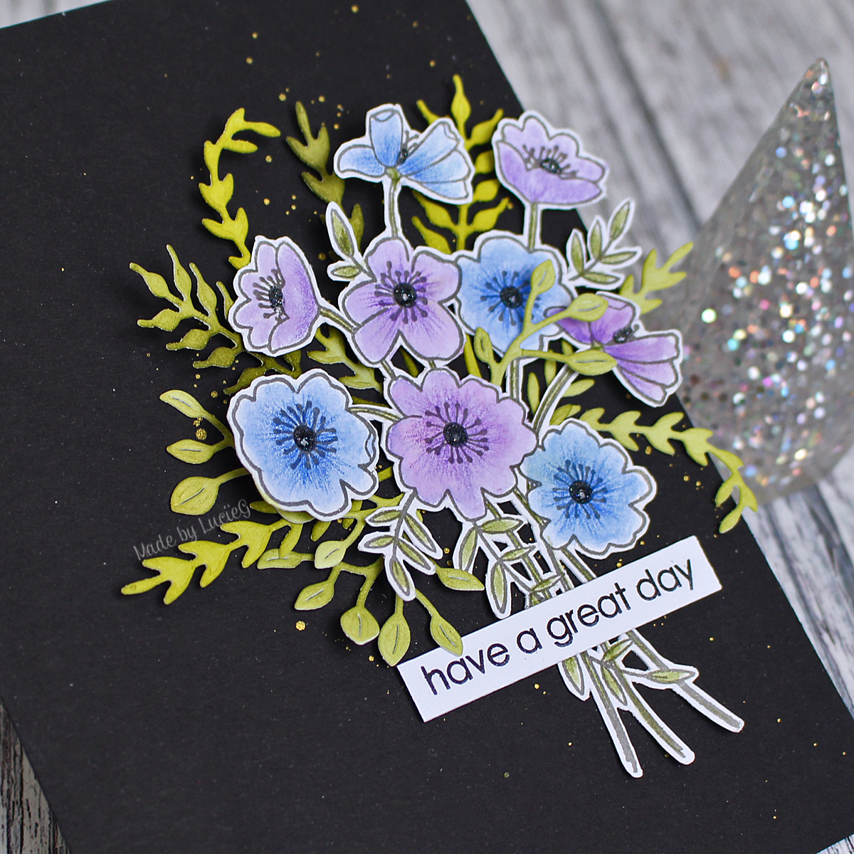 As I couldn’t see a piece of white card on my table at the time, I was using some black card to collect all my die cut images but I ended up really liking how the black card made the bouquet and die cuts pop! Quite dramatic! So I stepped outside my comfort zone and went with the black card base!