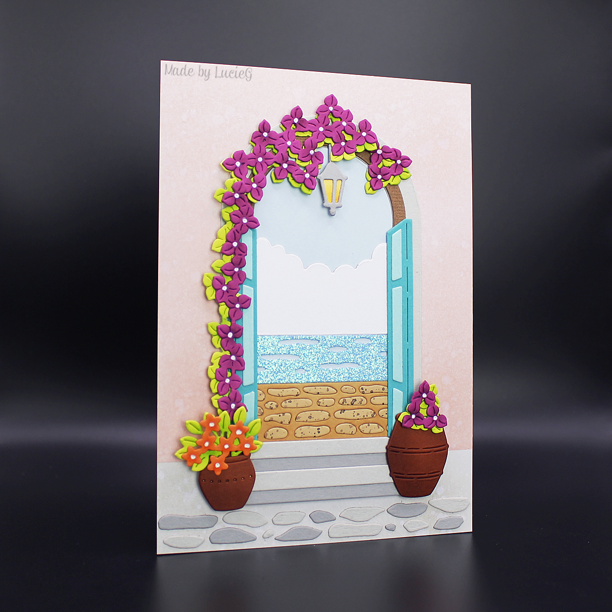 Next up was Channin Pelletier’s card using my favourite product from the kit – am amazing die set called Beyond the Door. I’ve already played with this for this card and I think I will be reaching for it again and again! The kit included an amazing selection of coloured cardstock which I was particularly keen to see as it’s so hard choosing cardstock online. I supplemented it with some of my own cardstock for this card – including glitter card for that sea!