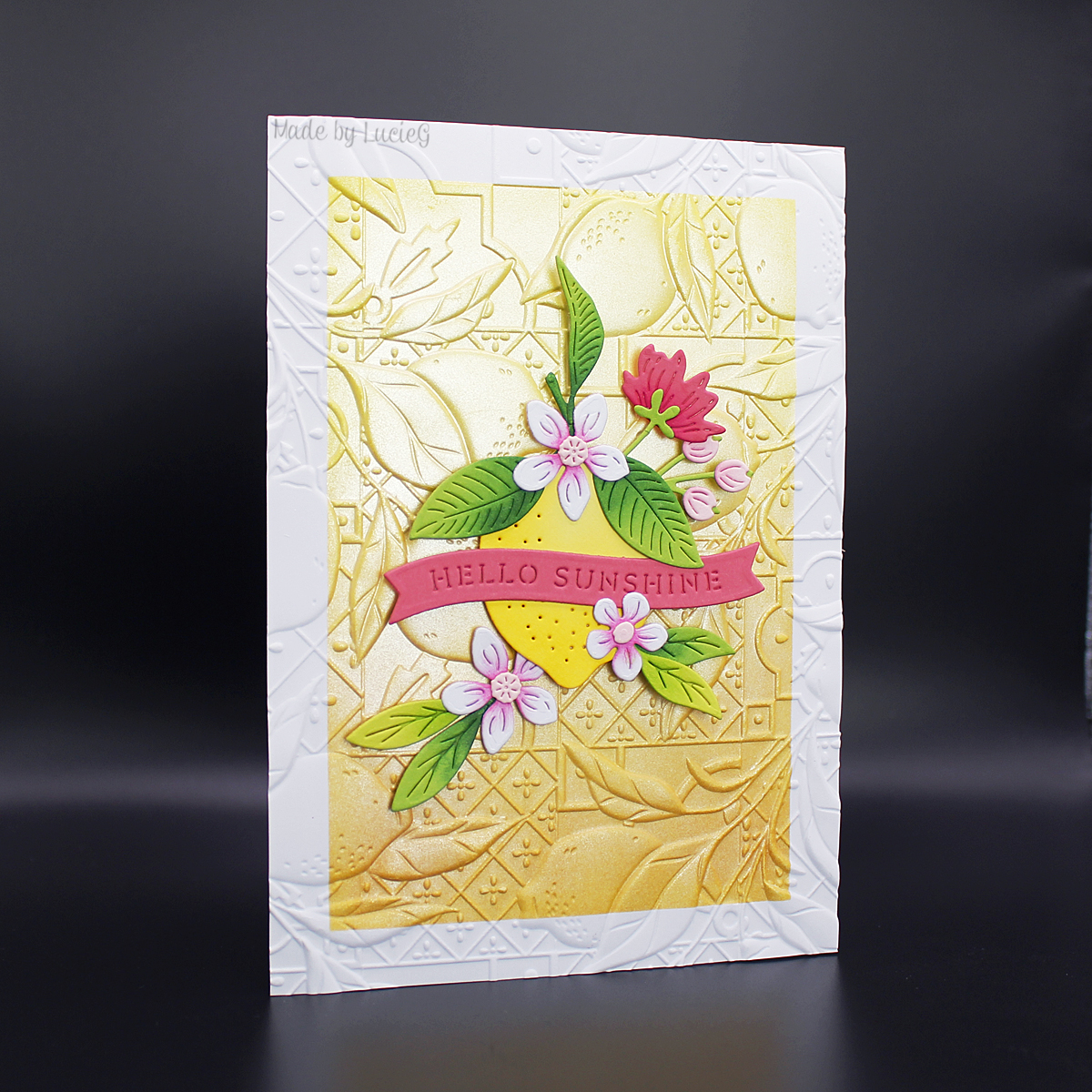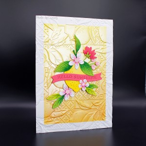 I veered away from Cathy’s instructions on the second card – instead of embossing a yellow panel with the folder, I masked off a centre section, blended two distress inks (Mustard Seed and Wild Honey), rubbed in some Perfect Pearls, removed the masking tape and embossed the entire panel. It’s on old school Jennifer Maguire technique which she used with what I believe were the OG 3D embossing folders by We R Memory Keepers. Her post about this is still on her blog!