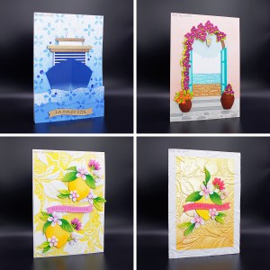Kim Kesti was first up on Day/Evening 1 (which I watched the following morning) and used a fabulous ship die set called Deckside Dreams. Kim’s ship was pretty colourful but as I’ve only been on one cruise (with Holland America), I used that ship as inspiration for a more monochromatic take. I sponged a little white ink on the hull/bow of the ship to mimic breaking waves.