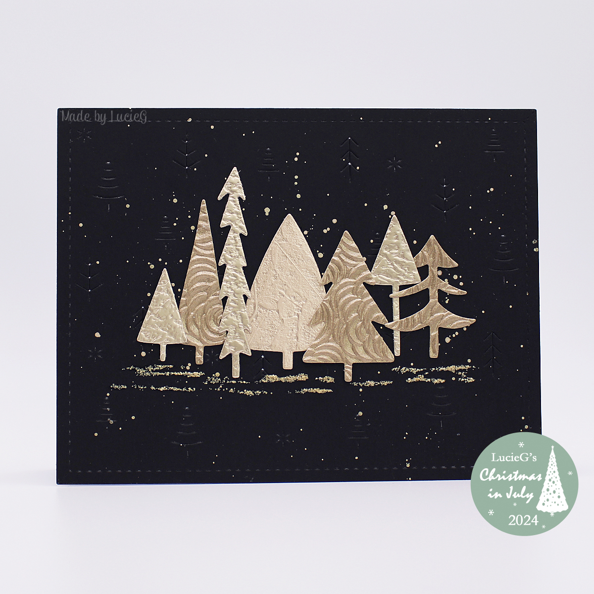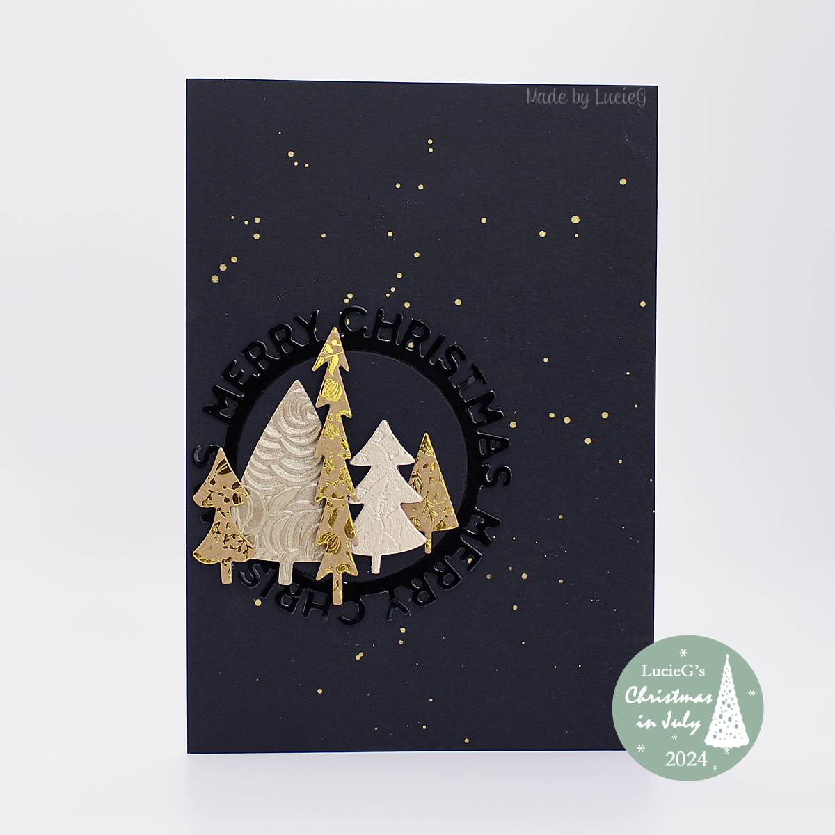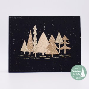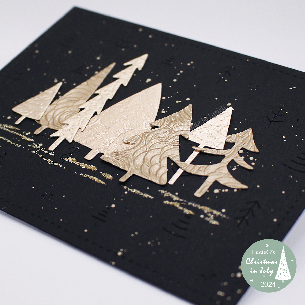 For my first card, I cut some black card with the fabulous Heffydoodle background die and added a generous amount of ink splatters! After I had arranged all my trees, I used Scattered Straw distress stickles to ground my little forest.