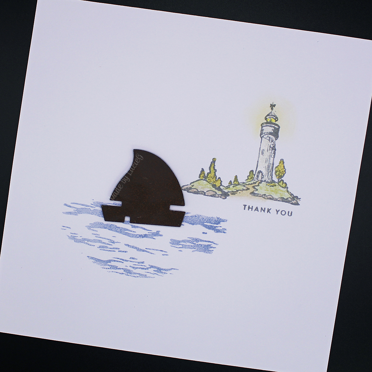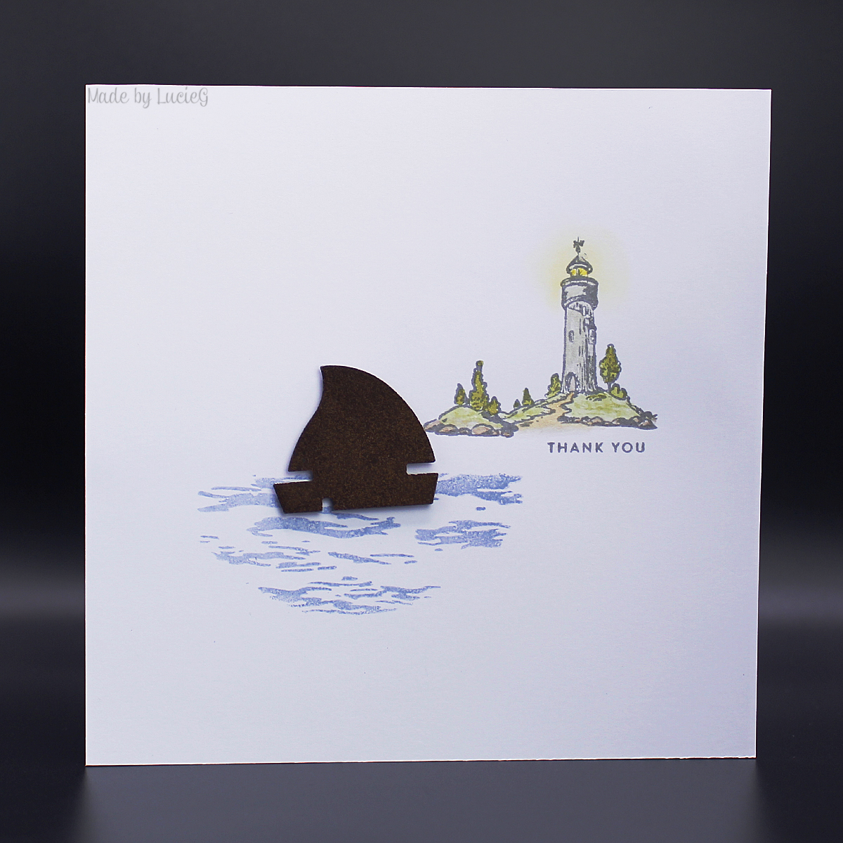 Armed with my little boat and stamp set, I got crafty! I masked off a section of my card so that the rectangular sea stamp would appear more oval and I coloured the lighthouse image with my Twinkling H2O paints. I decided not to use a sentiment from the stamp set and instead used a small stamp from an older Simon Says Stamp set.