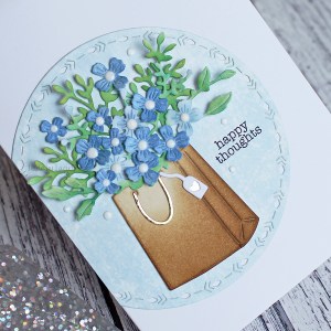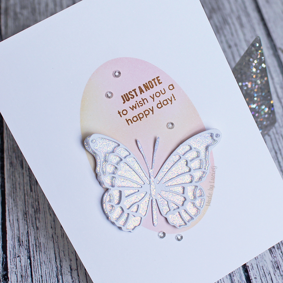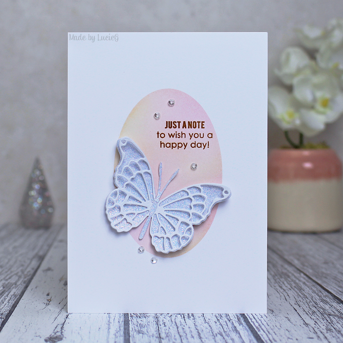 Once I decided on my design and dies, I got to work blending a central oval. I die cut the Asti and Willoughby Butterfly wings dies from white card and white glitter card and adhered them all together. I worked out where I would position the butterfly before stamping the Altenew sentiment. After adhering my butterfly, I added a few baby sequins and hey presto, my card was finished!