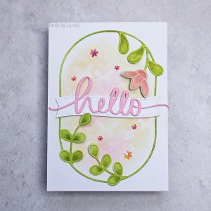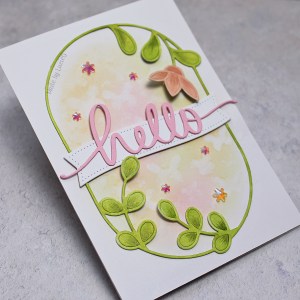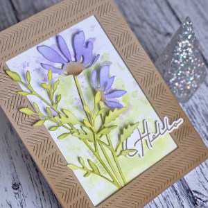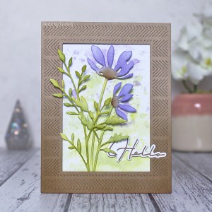 I smooshed green and purple distress ink onto the card base and coloured the Memory Box Daisy Stems die cuts with the same colours as the background dried. After adhering the diecuts and frame, I added a Memory Box sentiment to complete my card.