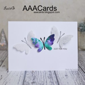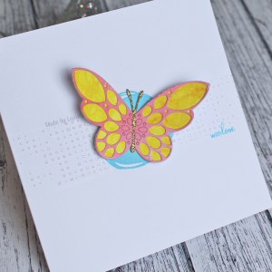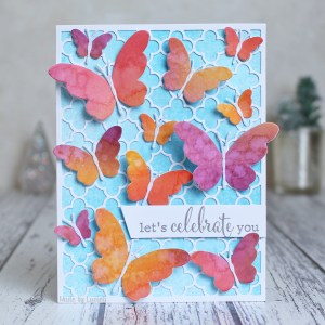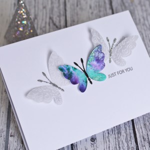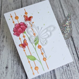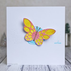 I spent a little while selecting an image to use for my take – ultimately I settled on the beautiful Adeline Butterfly die by Simon Says Stamp which I cut from a background I made some time ago from Colour Bursts. I also cut the butterfly twice from vellum which I then embossed using a folder from my collection.