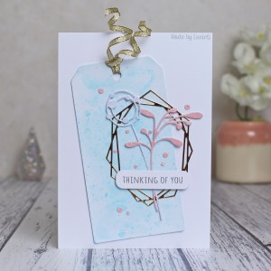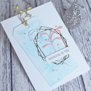I started with a die cut tag which I altered by smooshing some Tumbled Glass distress ink. Then I cut an Altenew frame from metallic gold cardstock. Having seen the photos, I’m glad I added the gold ribbon because you can’t really see that the frame is gold, can you? I added a couple of Simply Graphic die cuts and a few pink dots. The sentiment is by Poppystamps.